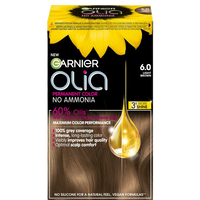 Garnier Olia drivs med kraften från 60 % oljor* för maximal färgprestation och ger en synlig förbättring på hårets kvalitet. Ger upp till 100 % gråhårstäckning och optimal komfort för din hårbotten. 98 % av kvinnorna hittade inga skador på håret**. *I färgkrämen. **Användartest, 262 kvinnor, användning av hela förpackningen.